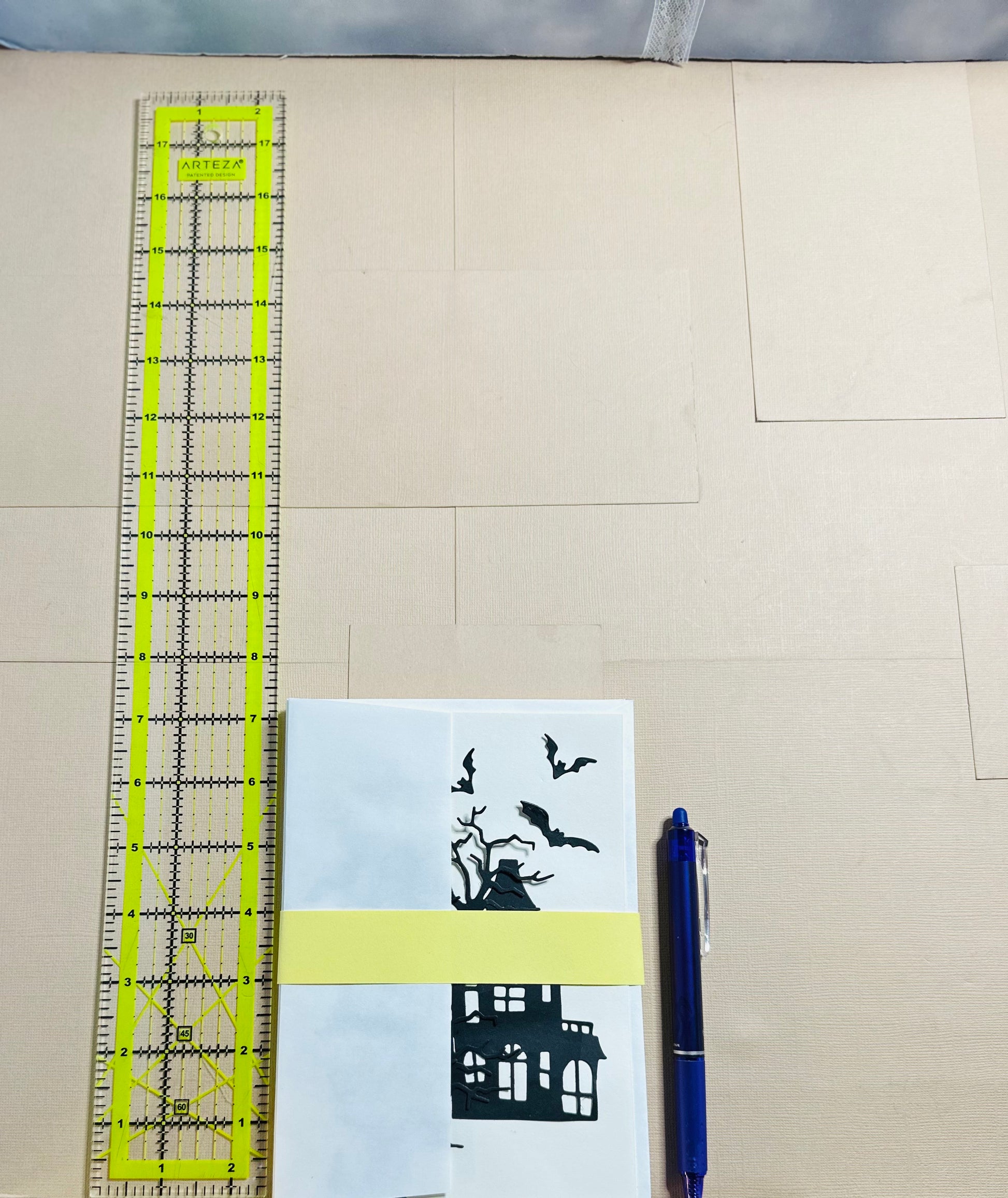 This spooky scene welcomes children of all ages to be courageous and Trick or Treat at this house. It has loose tree limbs that appear to sway in a cool breeze under a full moon with bats flying overhead. Cross the cemetery, if you dare! We used a Recollections Halloween Collection of die cuts to create this scene from black, yellow and grey papers.