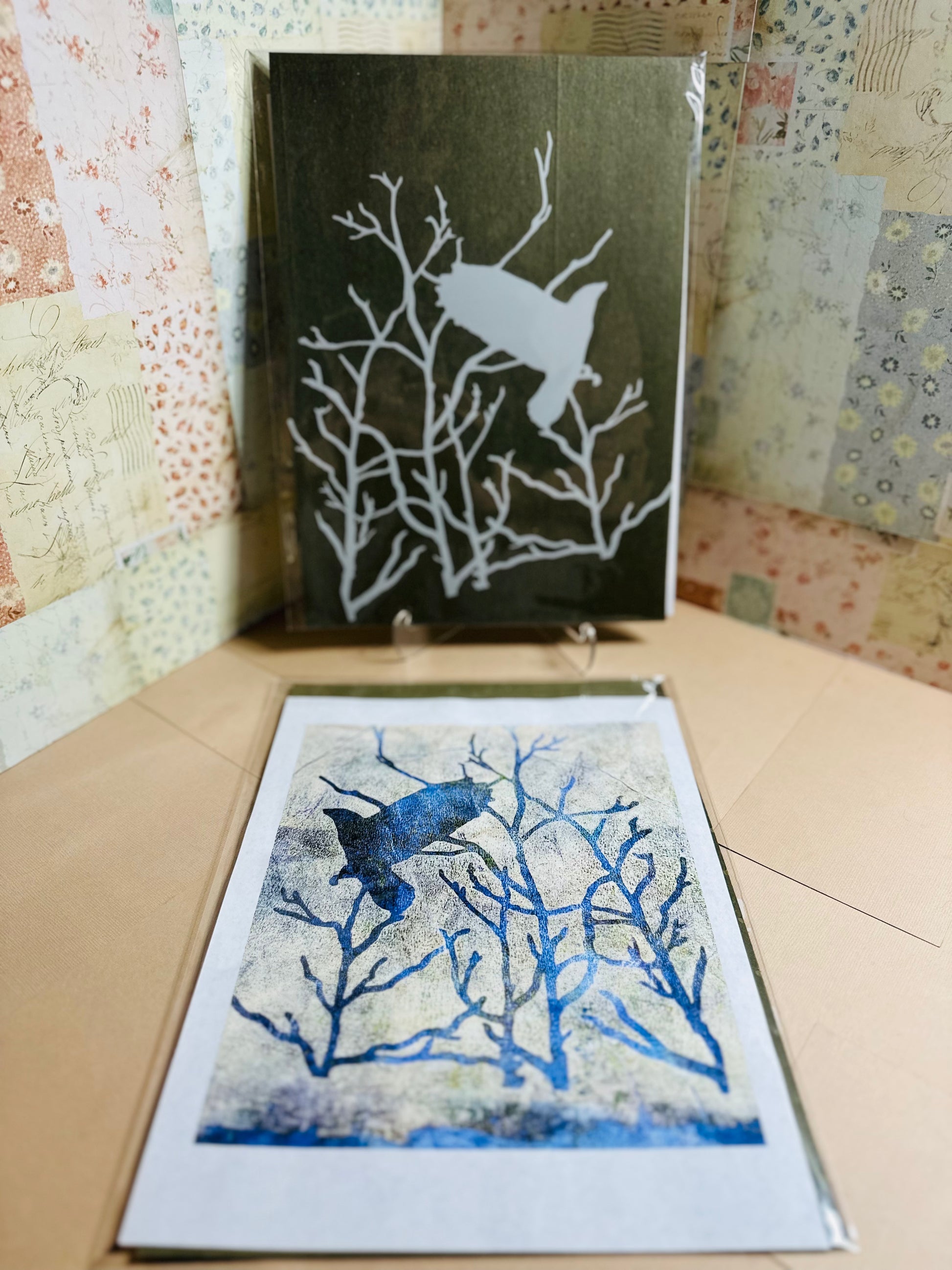 - Next roll white paint onto the gelli plate and place the Bird Stencil Mask on top of it. Then place the paper from #1 and rub it to transfer the paint onto the paper as a second layer. Then pull that print.
