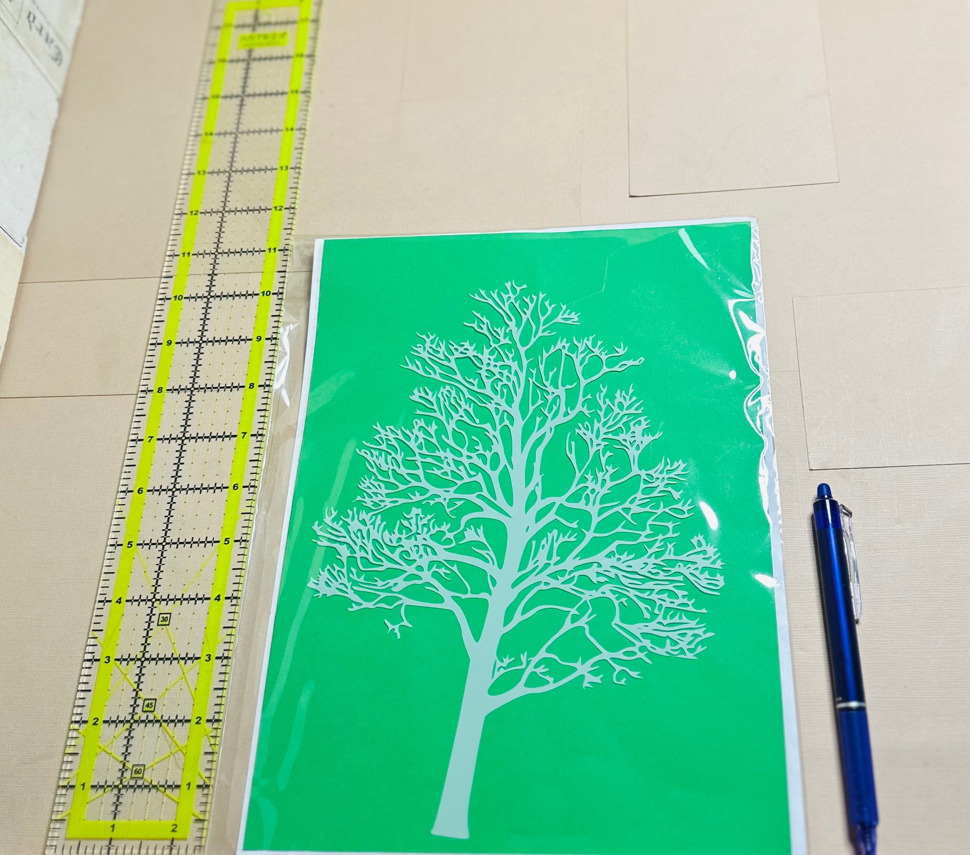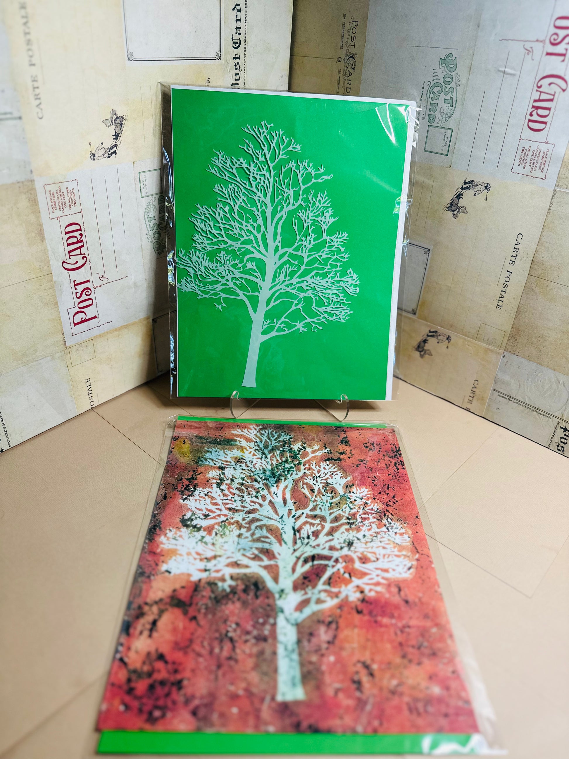 This sassafras tree stencil mask is a template used to transfer the tree pattern to paper or other firm surface. The mask will cover areas creating a negative space or to protect existing elements from new layers of color or texture being added to the print. Mask cut from Archival polyester film from Dura-Lar.