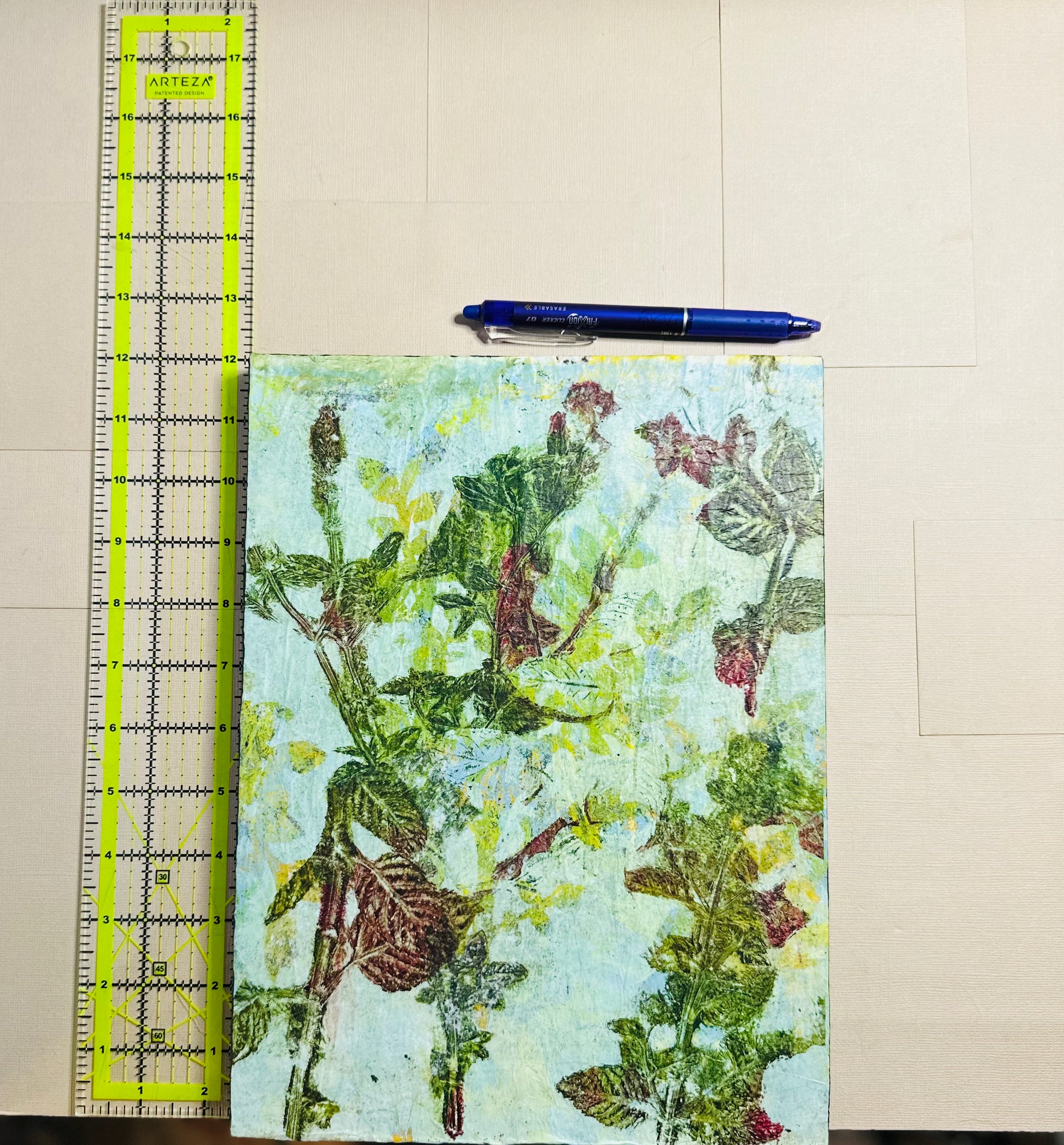 There are six layers of gel printed botanicals on tissue paper providing texture and depth and visual interest as they blend in the creation of this painting.