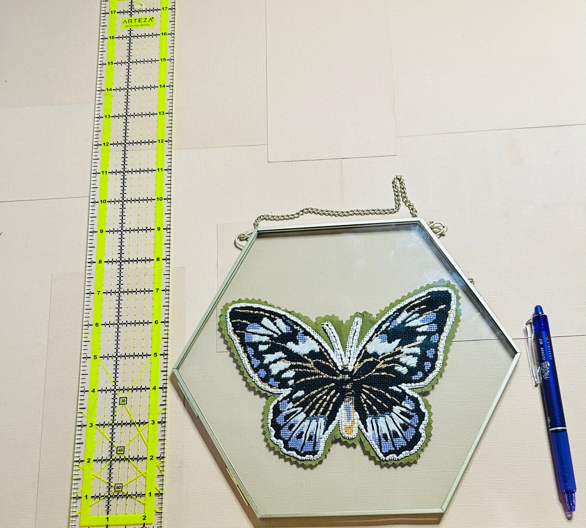 Add this framed Hexagon Butterfly needlepoint art piece, painted by Initial K Studio and finished in an ornate, hexagon, gold frame, to your home decor/art collection! Stitched and finished by @HettyPoint